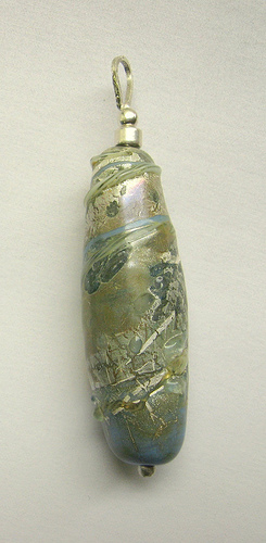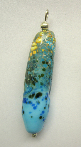 The Spring Rain design has been very popular, so I’ve decided to turn it into a collection – this bead is #3 (sold). The Spring Rain series is made with various combinations of transparent and opaque light blue glass, silver, and blue and white frit. I love the way each bead maintains its own unique shape and personality while still remaining in the same family. In this bead, one of the middle frits turned slightly green (a lovely but unexpected reaction!) and the white frit was fumed a deep gold by the silver leaf.