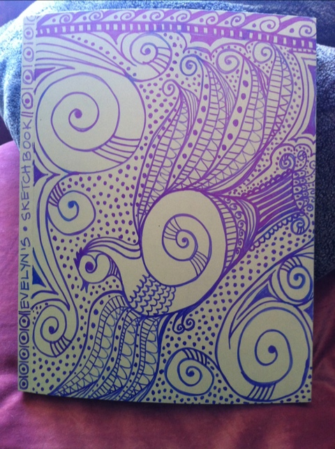 The result of that madness was a lot of new and fresh ideas… unfortunately though, drawn on random pieces of paper scattered throughout the house. So, a couple weeks ago I decided to buy myself a sketchbook and collect them all inside.  It came with a plain grey cover that practically begged for decoration so I freehanded a Holly Cooper style bird and some random doodling. I learned how to draw that style of bird with fine stringers on a bead in her class last month and i’m trying to find a way to use it on my beads while still making them look like my own.